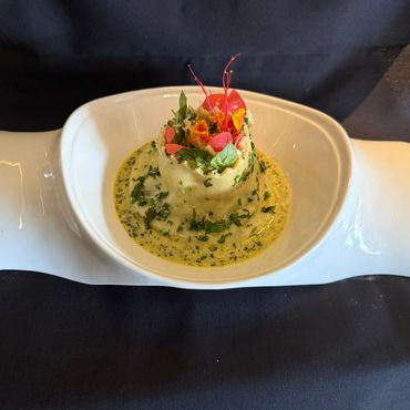Exquisita selección de mariscos frescos delicadamente cocidos y marinados, servidos sobre una base fresca y ligera, Realzada con notas cítricas.