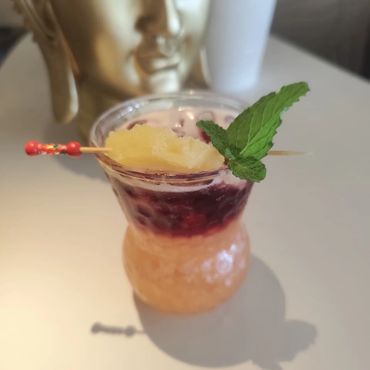 Elegante disco de sandía fresca que sirve de base a una cuidada selección de piña, melón, papaya, fresas, uvas y arándanos y un delicado toque de chinola. Decorada con flores comestibles frescas, y bañada sutilmente en su propio jugo.